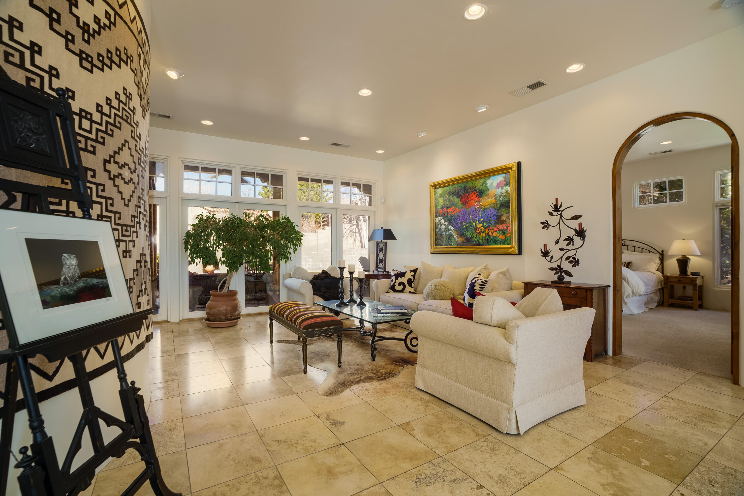 Feast your eyes on this Stunning One-Owner home in the Highly Sought-after Primrose Point Neighborhood of North Albuquerque Acres! Offering more than 3200 square feet of Interior Living space - and More Outside - this Custom Residence boasts a Gorgeous Interior with a Blend of Modern Elegance and Classic Southwestern Charm. Features include Diamond Plaster Walls, Vigas with Coving between, 2 cozy Kiva Fireplaces, Main Level Primary Wing, All Walk-in Closets - Two in the Primary, a Photographer's Darkroom with Developing Bath, a Writing Nook, Custom Doors, and Top-down/Bottom-up Blinds to take advantage of the Light and Views while maintaining Privacy. Outside you'll find a Wrap Around Balcony with Show-Stopping Mountain Vistas, an Outdoor Kitchen with Grill and Fridge, a 3rd Fireplace and